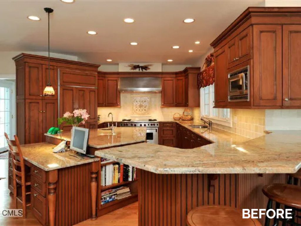 What began as a dark, crowded kitchen with obstructed views and uneven surfaces is now a light-filled social hub with layered materials, elevated finishes, and an intuitive sense of flow. For a busy homeowner in Ridgefield, CT, with an active family and a love of entertaining, Karen Berkemeyer Home delivered a complete transformation.