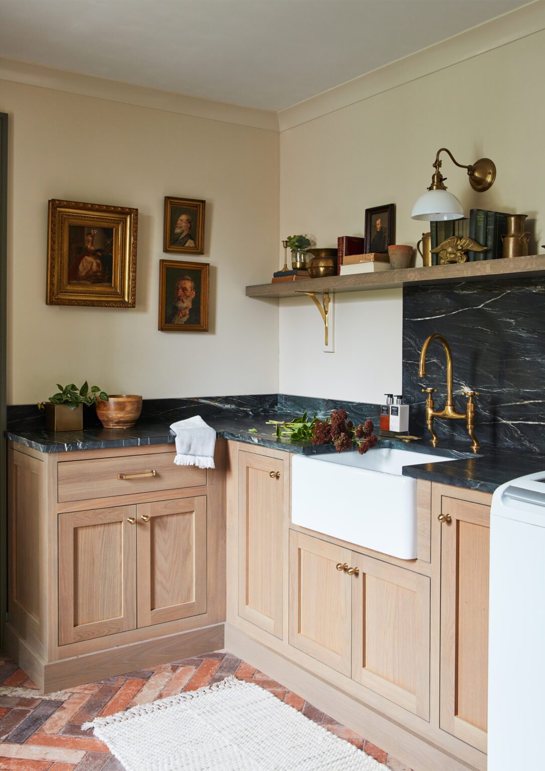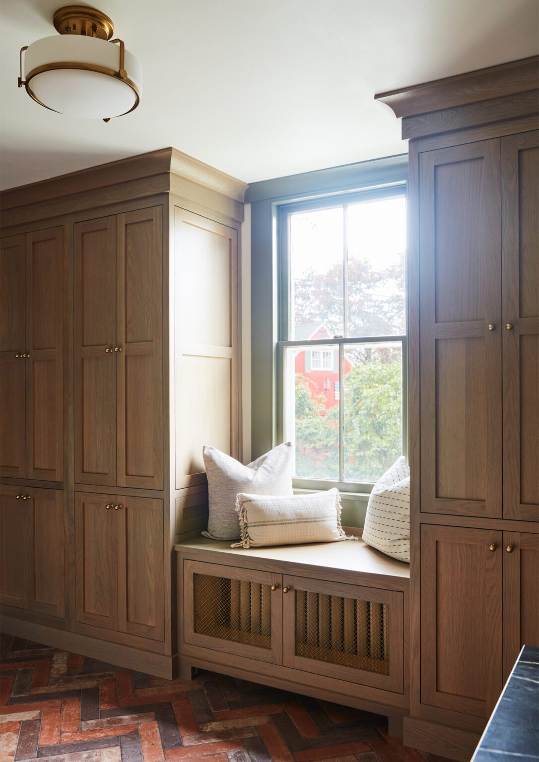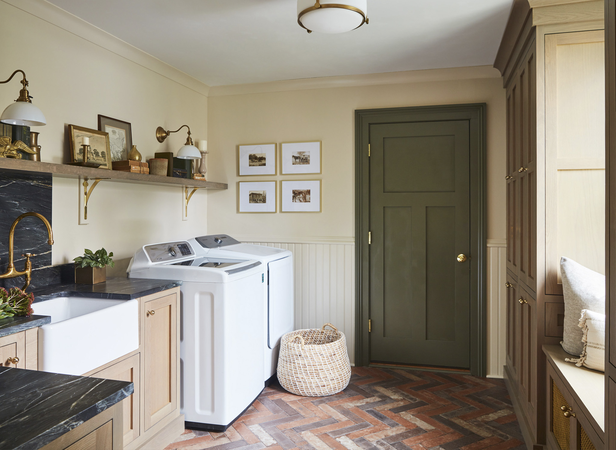 This cozy multi-purpose mudroom is the true embodiment of the fall season. Designed to be aesthetically pleasing yet practical, this cozy traditional farmhouse has warm wood tones, brass plumbing and hardware, a farm sink, framed inset style cabinets, dark countertops and a faux brick porcelain floor.