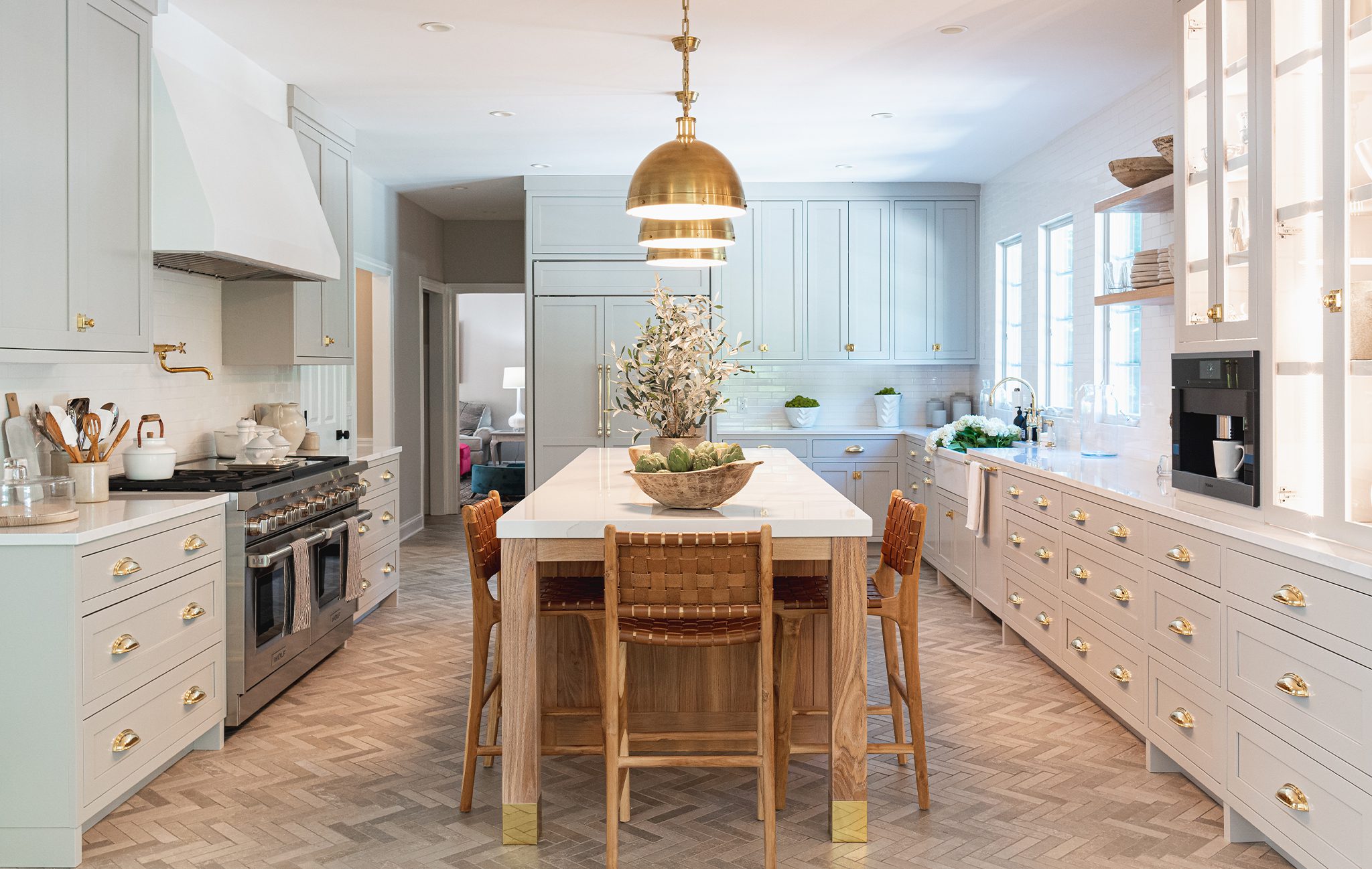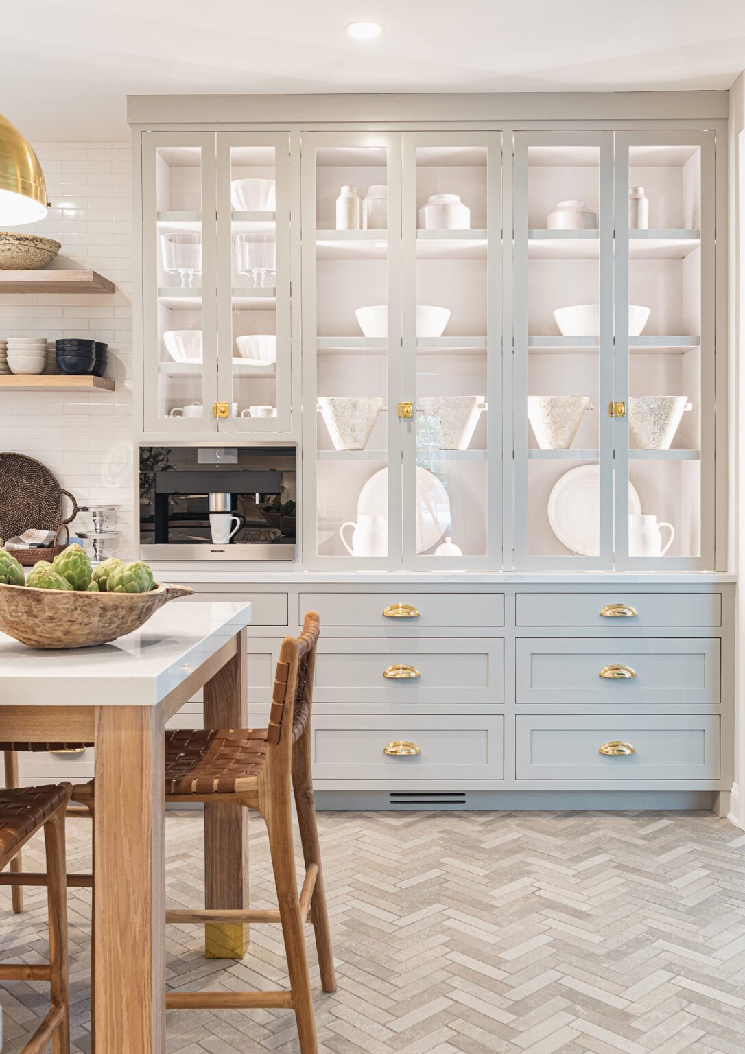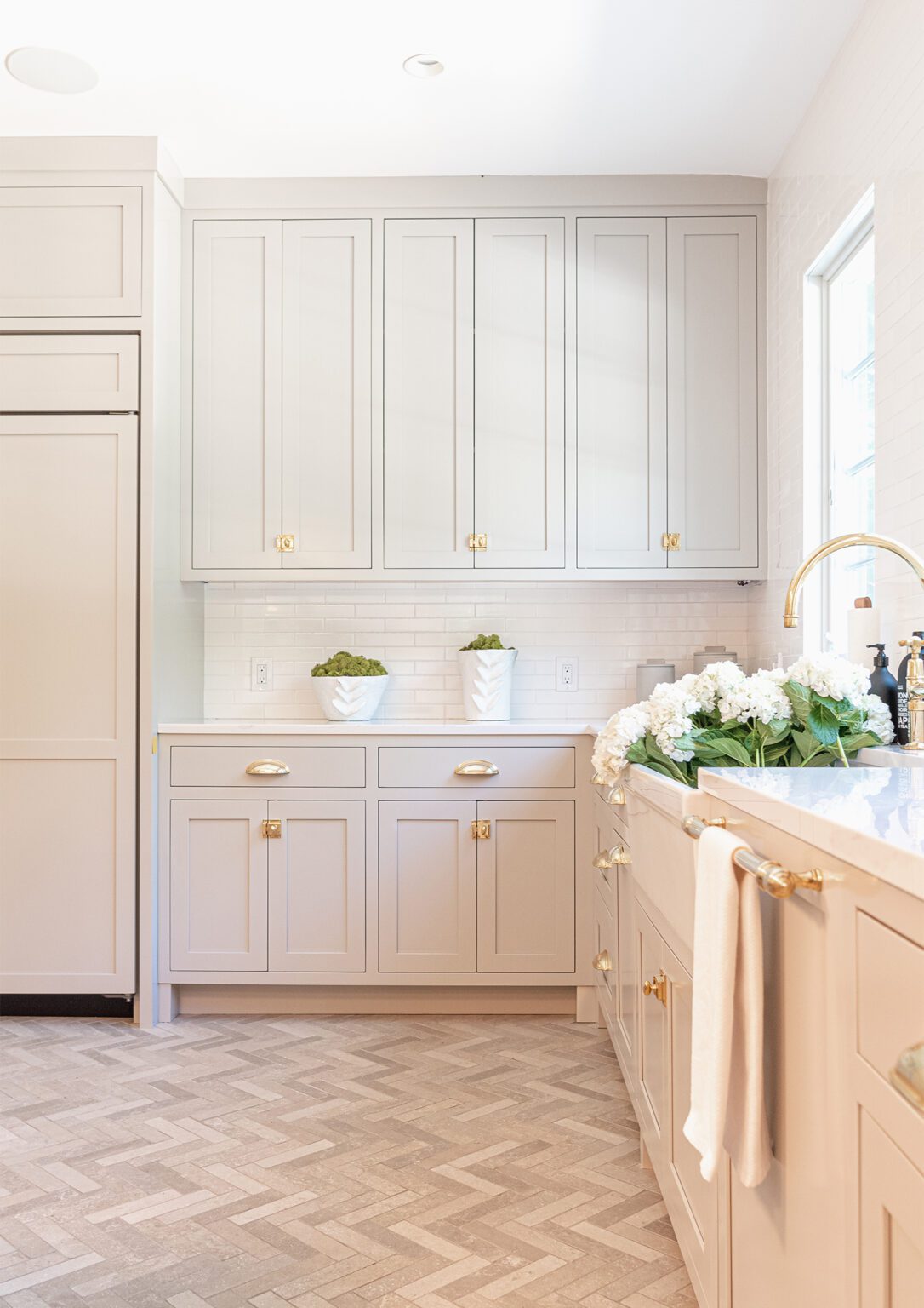 A high end, sophisticated look with a warm and inviting feel. This beautiful country-style space is designed with lacquered taupe cabinetry complimented by touches of bleached oak. Paired with polished brass, old fashioned latches and cup handles. The tumbled marbled porcelain floor set in a herringbone pattern steals the show, running through the whole first floor of the house.